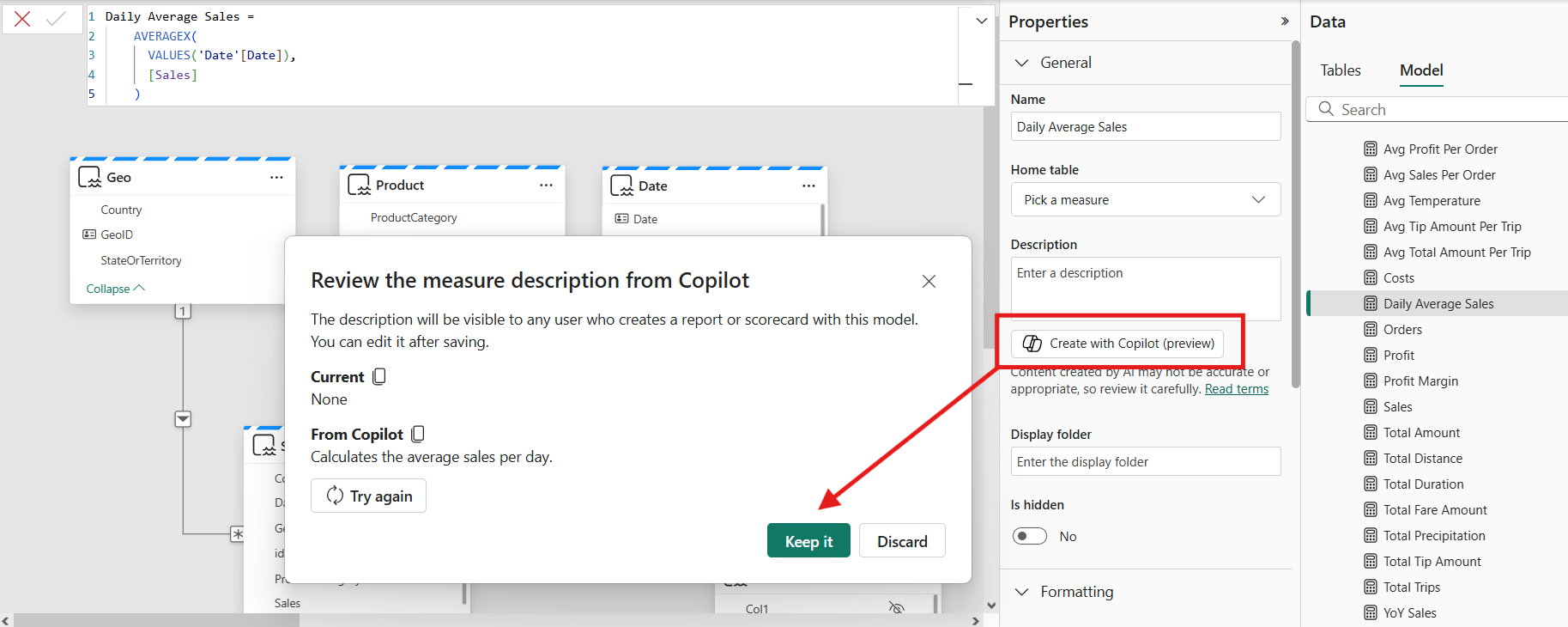 - Die generierte Beschreibung ist eine Beschreibung in natürlicher Sprache, die auf der DAX-Formel der Messung basiert. Wenn die DAX-Measureformel aktualisiert wird, kann der Modellautor erneut auf die Schaltfläche klicken, um eine aktualisierte Beschreibung zu Copilot erstellen. Diese Beschreibung ist wichtig, da Berichtsautoren nur den Namen und die Beschreibung eines Measures sehen können, wenn sie bestimmen, welches Measure in ihrem Bericht verwendet werden soll. Copilot kann dem Modellautor helfen, Zeit zu sparen, da das Erstellen von Beschreibungen eine zeitaufwendige Aufgabe sein kann.
