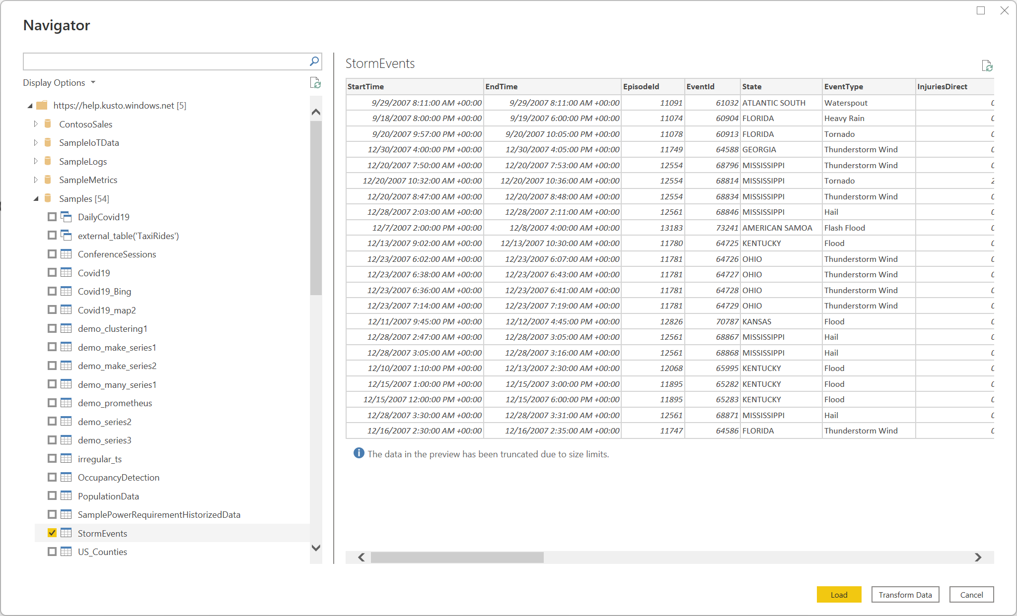Wählen Sie in Navigatordie gewünschten Datenbankinformationen aus, und wählen Sie dann entweder Laden aus, um die Daten zu laden, oder Daten transformieren, um die Daten im Power Query-Editor weiter zu transformieren. In diesem Beispiel wurde StormEvents in der Beispieldatenbank ausgewählt.