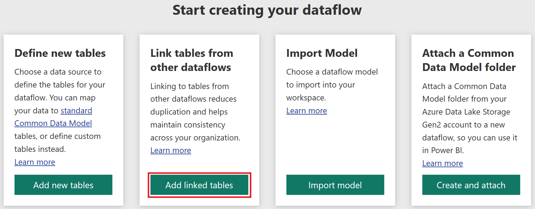 - Der Datenfluss muss sich in einem neuen Power BI-Arbeitsbereich oder in einer Power Apps-Umgebung befinden.