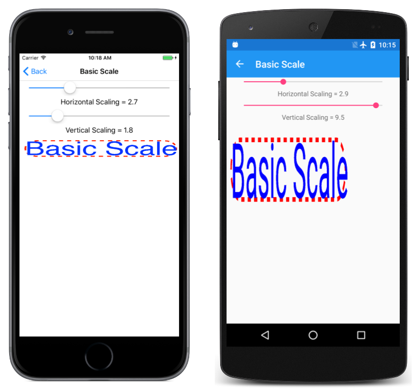 Auf der Seite "Einfache Skalierung " wird die Scale Methode veranschaulicht. Die Datei BasicScalePage.xaml enthält zwei Slider Elemente, mit denen Sie horizontale und vertikale Skalierungsfaktoren zwischen 0 und 10 auswählen können. Die BasicScalePage.xaml.cs CodeBehind-Datei verwendet diese Werte, um aufzurufen Scale , bevor ein abgerundetes Rechteck mit einer gestrichelten Linie angezeigt wird und die Größe so angepasst wird, dass text in die obere linke Ecke des Zeichenbereichs passt:
