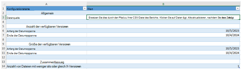 Wenn Sie den Datumsbereich der Diagramme im Arbeitsblatt Anzahl der verfügbaren Versionen oder Größe der abgelaufenen Versionen ändern möchten, ändern Sie die entsprechenden Werte in zellen B6, B7, B10 und/oder B11. Dies ist optional.