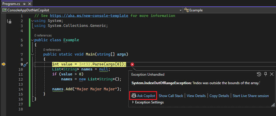 IndexOutOfRangeExceptiontritt auf, und die App wird angehalten, wobei die Ausnahme angezeigt wird.Um KI-Unterstützung für die Ausnahme zu erhalten, fahren Sie mit dem nächsten Abschnitt fort.