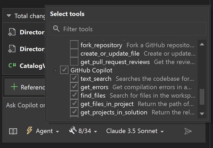 Screenshot mit zusätzlichen Tools, die der Agentmodus verwendet.