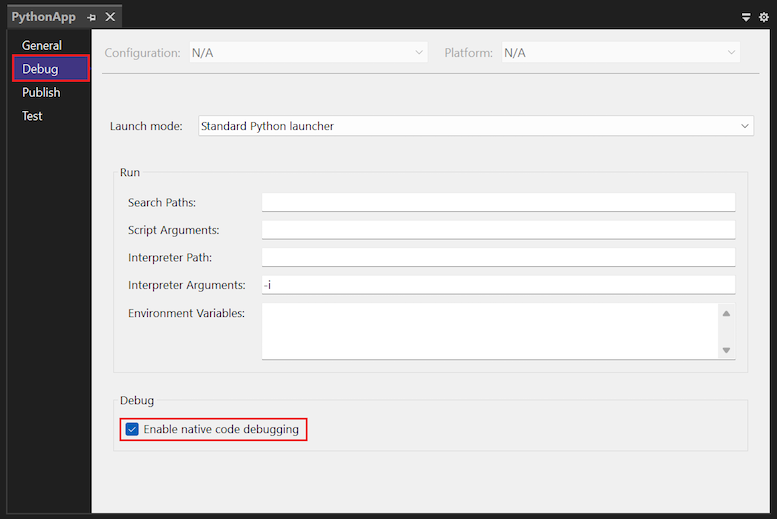 Wählen Sie im Eigenschaftenbereich die Registerkarte " Debuggen " und dann die Debugoption "Systemeigenes>Codedebugging aktivieren" aus :