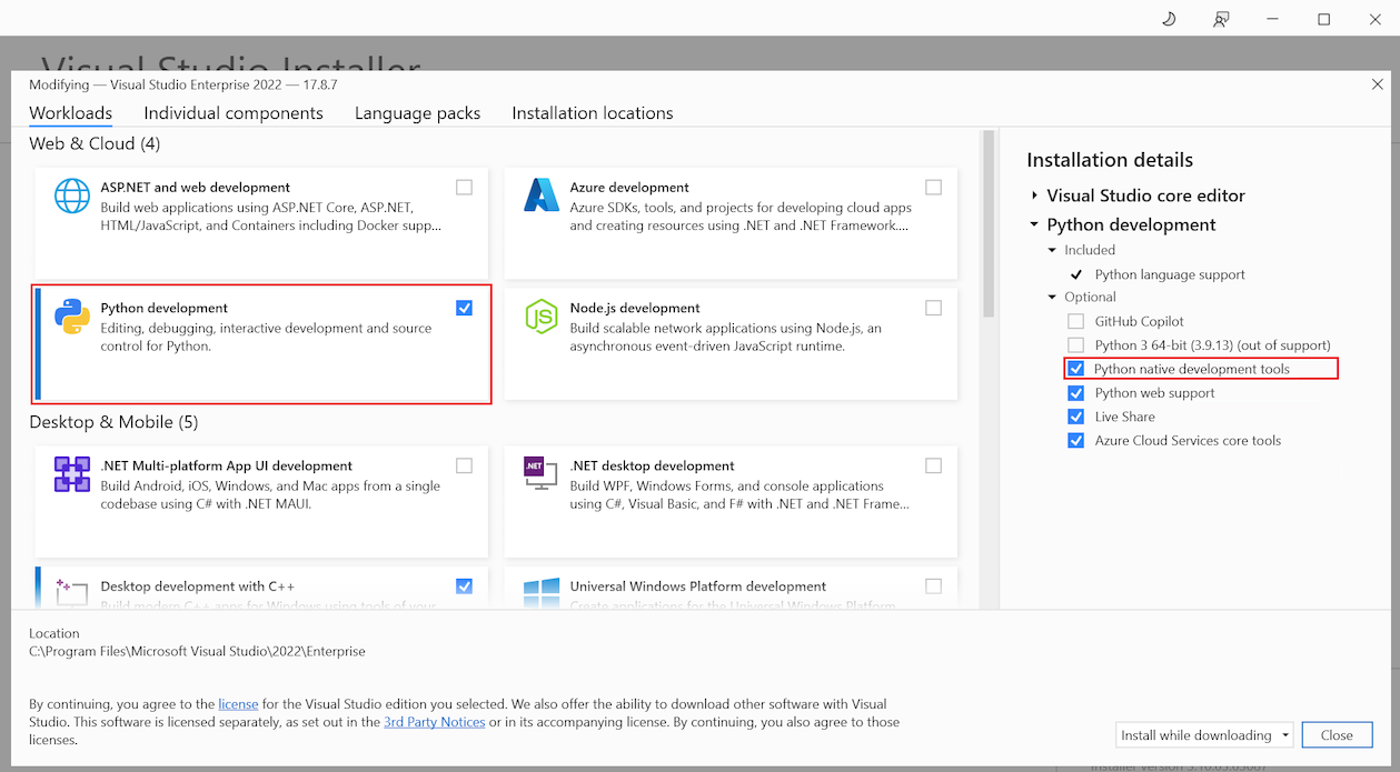 Wenn die Option "Python/Native Debugging " nicht angezeigt wird, müssen Sie zuerst die nativen Python-Entwicklungstools mithilfe des Visual Studio Installer installieren. Die systemeigene Debugoption ist unter der Python-Entwicklungsarbeitslast verfügbar. Weitere Informationen finden Sie unter Installieren der Python-Unterstützung in Visual Studio.