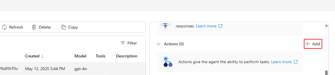 Scrollen Sie im Abschnitt "Setup" neben der Agents-Liste nach unten zum Abschnitt "Aktionen ", und wählen Sie "Hinzufügen" aus.