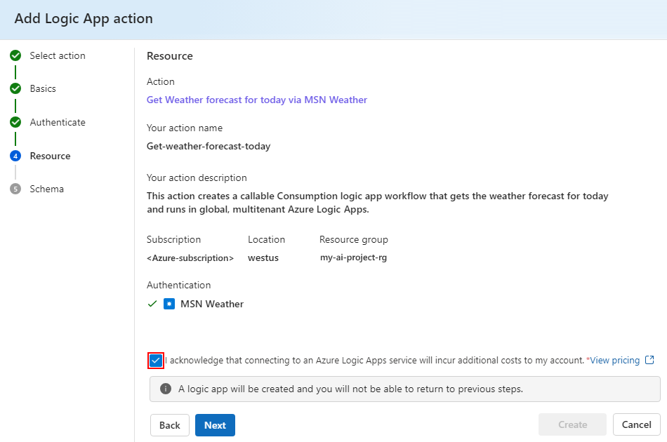 Überprüfen Sie im Fenster "Logik-App hinzufügen" unter "Ressource" alle angegebenen Aktionsinformationen.