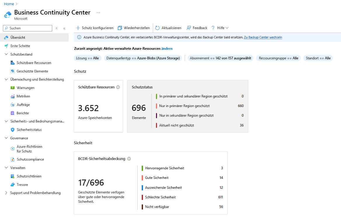 Resilienz bietet Ihnen eine einfache Möglichkeit, den Status des Schutzes geschützter Speicherkonten sowie Speicherkonten zu überwachen, für die die Sicherung derzeit nicht konfiguriert ist.
