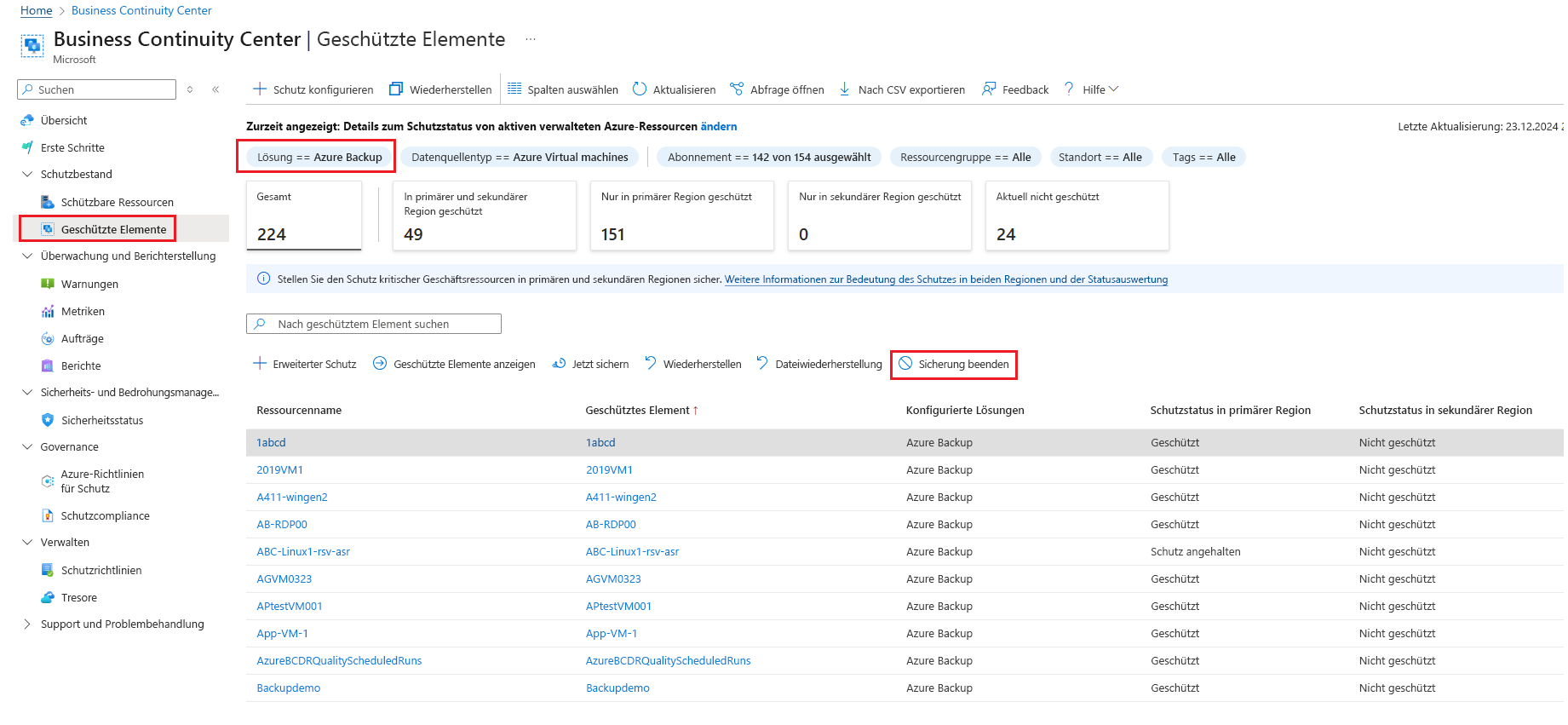 Sie können zur Sicherungsinstanz über das Speicherkonto gehen, indem Sie auf Speicherkonto>Datenschutz>Sicherungseinstellungen verwalten, oder direkt über Resilienz>Geschützte Elemente und dann Azure Backup als Lösung im Filter auswählen.