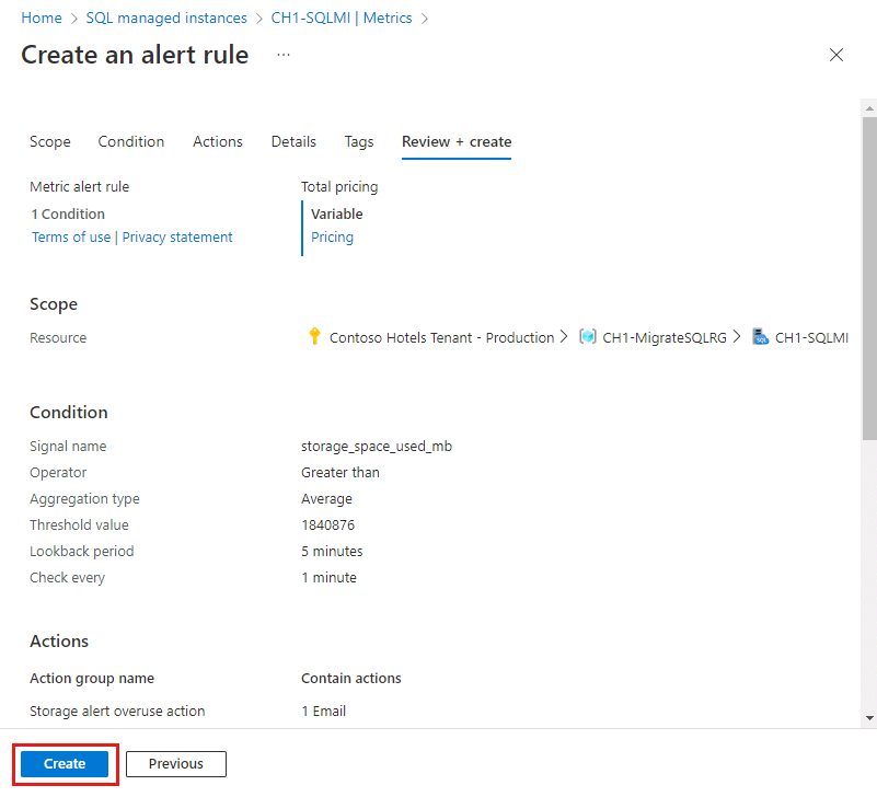 Field Description Überprüfen Sie alle Wählen Sie aus, wie oft die Warnungsregel überprüft, ob die Bedingung erfüllt ist. Rückblickperiode Wählen Sie den Rückblickzeitraum für die Überprüfung der Daten aus. Sie könnten beispielsweise jede Minute die letzten fünf Minuten überprüfen. Im im Screenshot gezeigten Beispiel wird der Wert von 1.840.876 MB verwendet, um einen Schwellenwert von 1,8 TB darzustellen. Da der Operator im Beispiel auf „größer als“ festgelegt ist, wird die Warnung ausgelöst, wenn die Speicherplatzbelegung für SQL Managed Instance 1,8 TB überschreitet. Der Schwellenwert für die Speicherplatzmetriken muss in MB ausgedrückt werden.