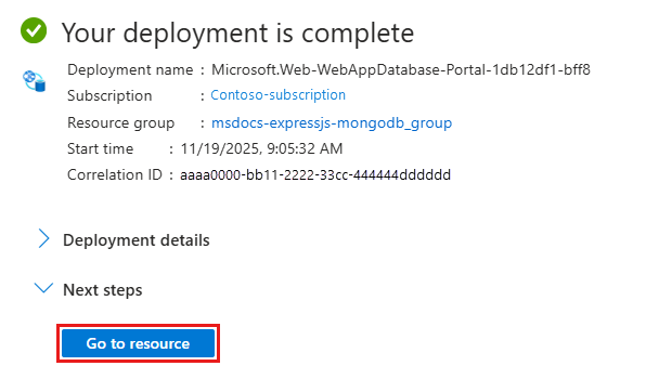 - Wählen Sie in der Ressourcengruppe"msdocs-expressjs-mongodb-tutorial" aus.