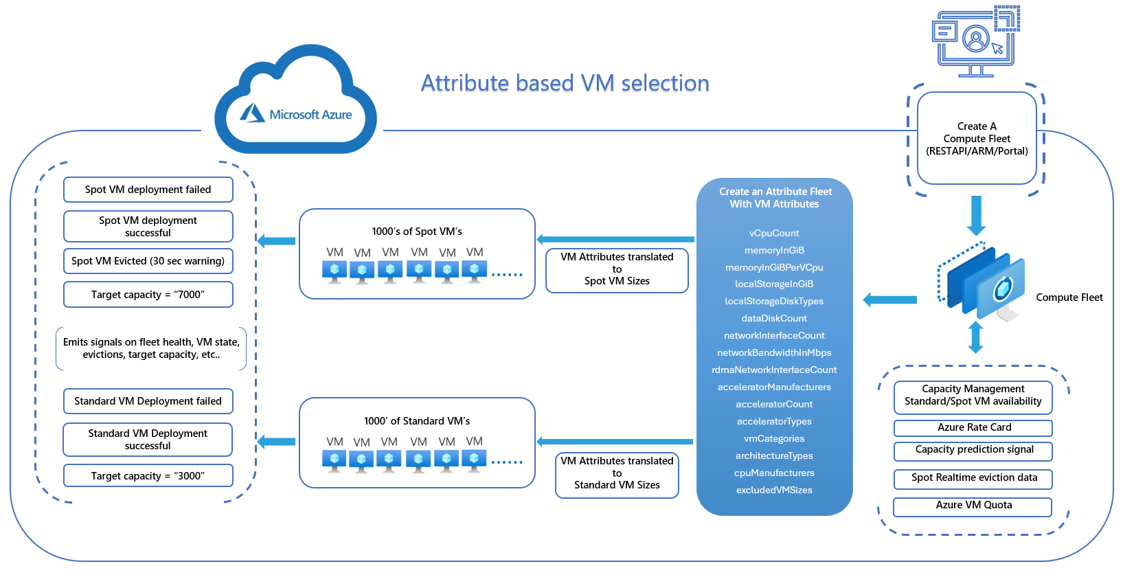 Mit dem Attributbasierten Auswahlfeature für virtuelle Computer (VM) können Sie Ihre Instanzanforderungen als eine Reihe von VM-Attributen konfigurieren, z. B. Arbeitsspeicher, vCPU und Speicher. Diese Anforderungen werden mit allen geeigneten Azure-VM-Größen abgeglichen, was die Erstellung und Wartung von VM-Konfigurationen vereinfacht. Mit diesem Feature können Sie auch nahtlos neuere VM-Generationen nutzen, sobald sie verfügbar sind. Sie erhalten auch Zugriff auf eine größere Bandbreite an Kapazität über Azure Spot Virtual Machines. Der Compute Fleet-Dienst wählt virtuelle Computer aus, die den angegebenen Attributen entsprechen, und startet sie, sodass keine VM-Größen manuell ausgewählt werden müssen.
