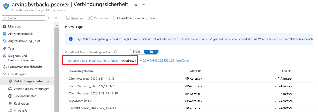 - Stellen Sie in Azure Database for PostgreSQL Server den Wert für Zugriff auf Azure-Dienste zulassen auf Ja.