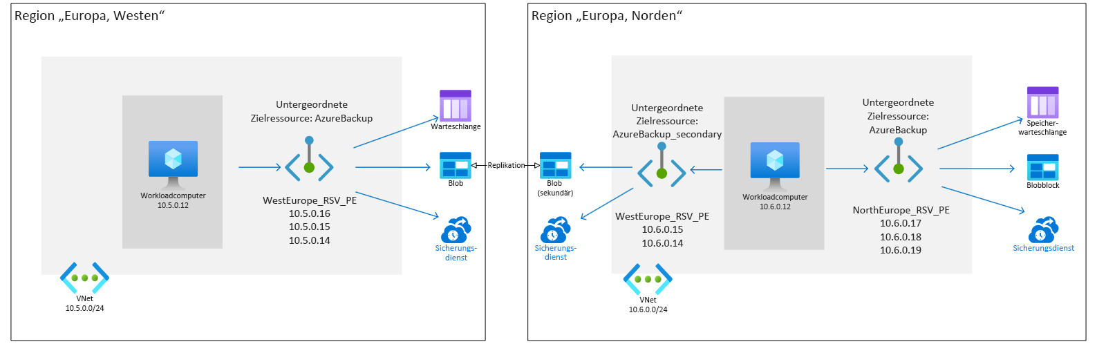 Mit Azure Backup können Sie Ihre Daten aus Ihren Wiederherstellungsdiensten sichern und wiederherstellen, indem Sie private Endpunkte verwenden. Private Endpunkte verwenden eine oder mehrere private IP-Adressen aus Ihrem virtuellen Azure-Netzwerk, um den Dienst effektiv in Ihr virtuelles Netzwerk zu integrieren.