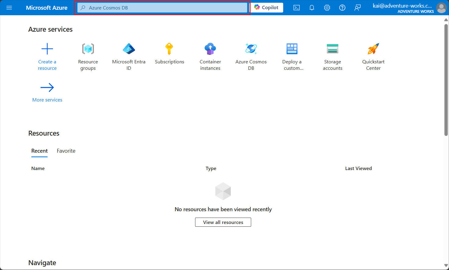 Geben Sie Azure Cosmos DB in die globale Suchleiste ein.