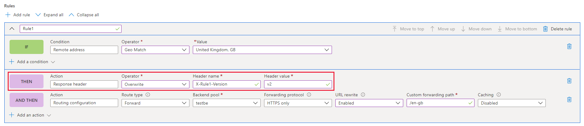 Wenn Sie überprüfen möchten, ob die Änderungen an Azure Front Door (klassisch) weitergegeben werden, können Sie mithilfe des folgenden Beispiels einen benutzerdefinierten Antwortheader in der Regel erstellen. Sie können einen Antwortheader (