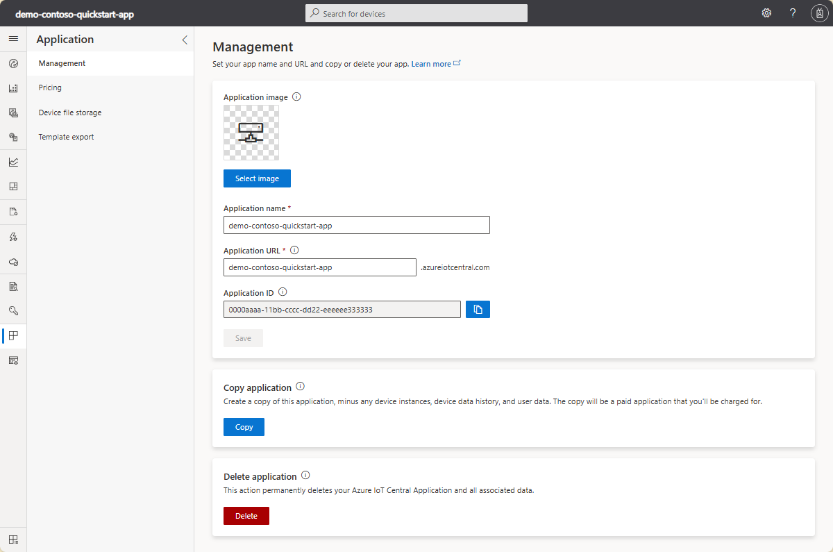 In diesem Artikel wird beschrieben, wie Sie eine Anwendung verwalten können. Sie können den Namen und die URL der Anwendung ändern, ein Logo hochladen und eine Anwendung in Ihrer Azure IoT Central-Anwendung löschen.
