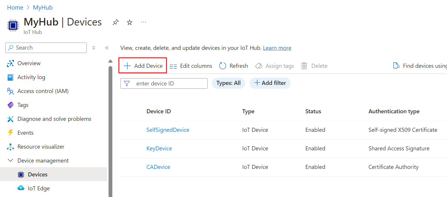 Wählen Sie Gerät hinzufügen aus, um Ihrem IoT-Hub ein Gerät hinzuzufügen.