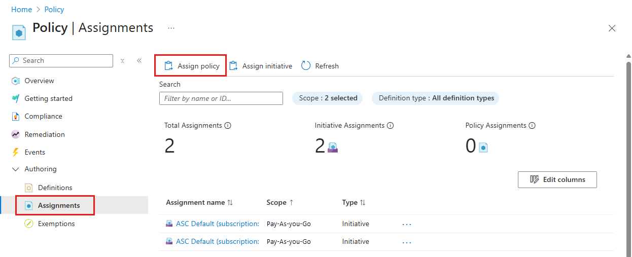 Wenn Sie die Richtliniendefinition zuweisen möchten, an der Sie die Richtlinie erzwingen möchten, erstellen Sie eine Richtlinienzuweisung, wie weiter unten in diesem Artikel beschrieben.