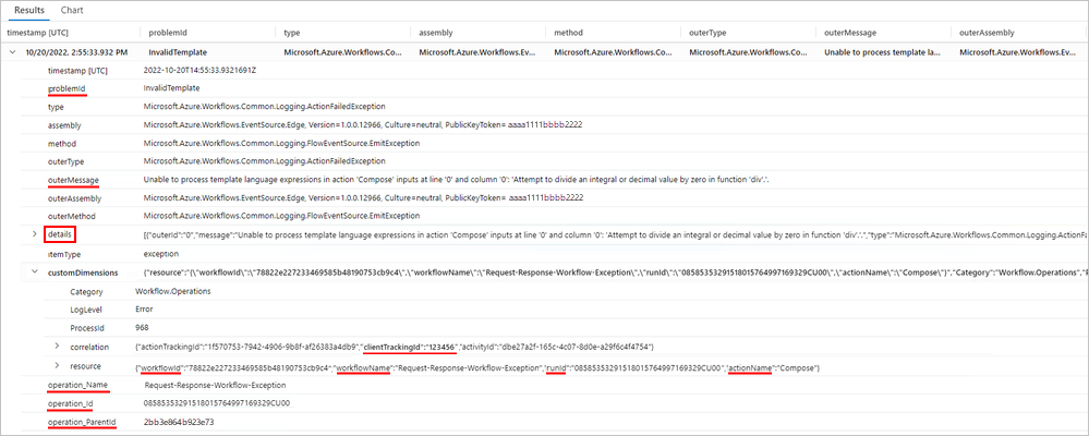 Eigenschaft BESCHREIBUNG problemId Ausnahmetyp oder eine kurze Beschreibung zu der Ausnahme, die aufgetreten ist outerMessage Ausführlichere Beschreibung zur Ausnahme Details Ausführliche und vollständigste Informationen zur Ausnahme clientTrackingId Clientnachverfolgungs-ID, falls angegeben workflowId ID für den Workflow, für den die Ausnahme aufgetreten ist workflowName Name für den Workflow, für den die Ausnahme aufgetreten ist runId ID für die Workflowausführungsinstanz actionName Name für die Aktion, die mit der Ausnahme fehlgeschlagen ist operation_Name Name für den Workflow, für den die Ausnahme aufgetreten ist operation_Id ID für die Komponente oder den Workflow, die gerade ausgeführt wurde. Diese ID ist identisch mit dem RunId-Wert für die Workflowausführungsinstanz. Dieser Wert überschreitet Tabellen, sodass Sie diesen Ausnahmedatensatz mit der Workflowausführungsinstanz verknüpfen können. operation_ParentId ID für den Workflow, der die Aktion aufgerufen hat, die Sie mit der ID der Aktion in der Tabelle „Anforderungen“ verknüpfen können Um die Ausnahmen für einen bestimmten Workflow anzuzeigen, erstellen und starten Sie die folgende Abfrage: