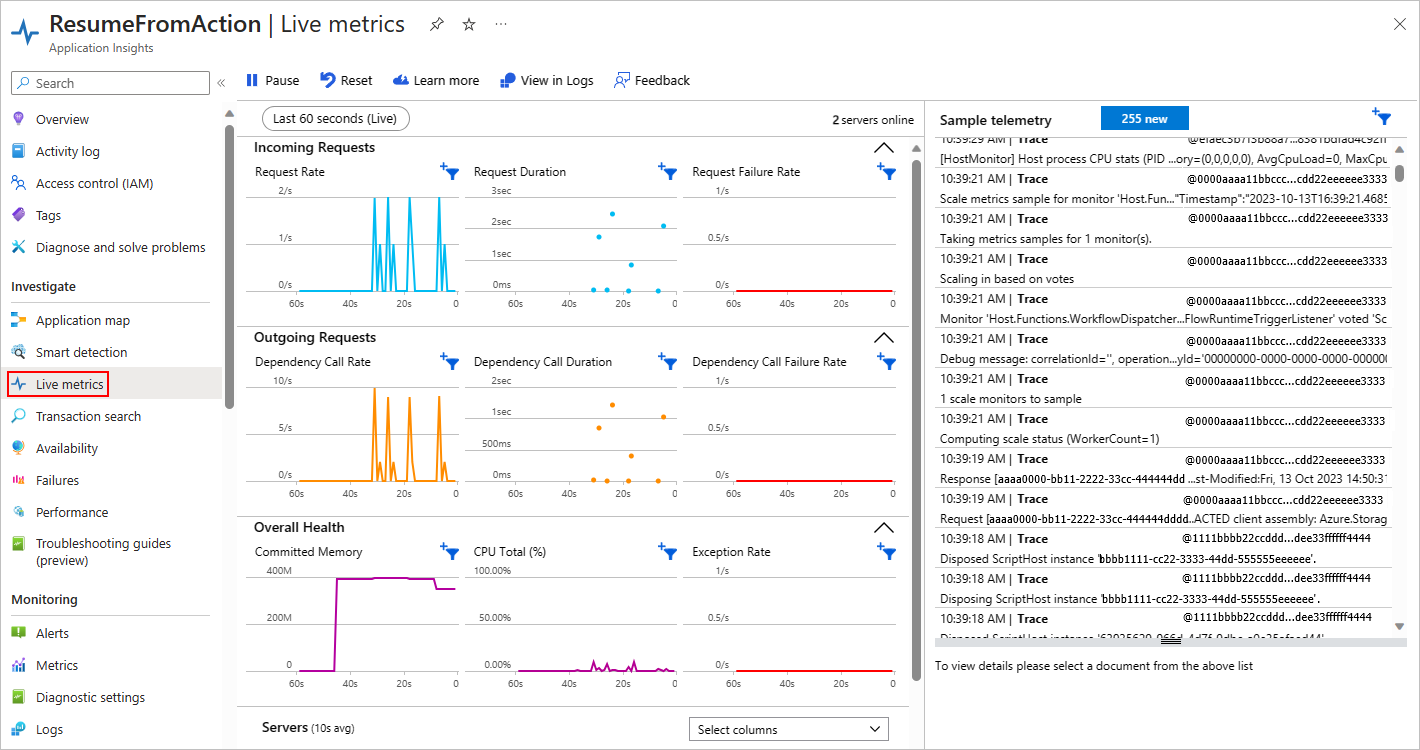 Mit Ihrer Logik-App, die mit Application Insights verbunden ist, können Sie über das Azure-Portal mithilfe von Live Metrics Stream Protokolldaten und andere Metriken nahezu in Echtzeit anzeigen. Außerdem verfügen Sie über Visualisierungen, mit denen Sie eingehende Anforderungen, ausgehende Anforderungen, die allgemeine Integrität und den Zugriff auf eine Tabelle mit Diagnosen auf Ablaufverfolgungsebene darstellen können.