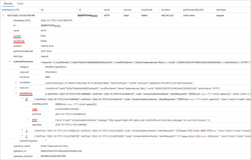union requests, dependencies | where operation_Id contains "<runId>"Diese Abfrage verwendet den Union-Operator, um Datensätze aus der Tabelle „Anforderungen“ und „Abhängigkeiten“ zurückzugeben. Die Abfrage verwendet auch den Eigenschaftswert operation_Id, um die Verknüpfung zwischen Datensätzen bereitzustellen, indem der gewünschte Wert für den Workflow runId-Wert angeben wird, z. B.: