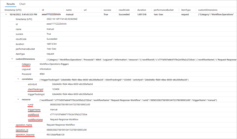 Eigenschaft BESCHREIBUNG Beispiel Kategorie Vorgangskategorie, die basierend auf dem Vorgang immer Workflow.Operations.Triggers oder Workflow.Operations.Actions ist Workflow.Operations.Triggers. clientTrackingId Benutzerdefinierte Nachverfolgungs-ID, falls angegeben 123456 runId ID für die Workflowausführungsinstanz 08585358375819913417237801890CU00 triggerName Triggername manuell workflowId ID für den Workflow, der den Trigger ausgeführt hat c7711d107e6647179c2e15fe2c2720ce workflowName Name für den Workflow, der den Trigger ausgeführt hat Anforderungsantwort-Workflow operation_Name Name für den Vorgang, der den Trigger ausgeführt hat. In diesem Fall entspricht dieser Name dem Workflownamen. Anforderungsantwort-Workflow operation_Id ID für die Komponente oder den Workflow, die gerade ausgeführt wurde. Diese ID ist identisch mit dem RunId-Wert für die Workflowausführungsinstanz. Wenn Ausnahmen oder Abhängigkeiten vorhanden sind, überschreitet dieser Wert die Tabellen, sodass Sie diesen Triggerdatensatz mit den Ausnahmen oder Abhängigkeiten verknüpfen können. 08585358375819913417237801890CU00 operation_ParentId Verbindungsfähige ID für den Workflow, der den Trigger aufgerufen hat f95138daff8ab129 Das folgende Beispiel zeigt die aufgeklappten Details für die Verfassen-Aktion :