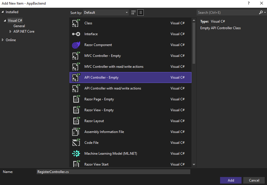 Geben Sie im Feld Controllername die Zeichenfolge RegisterController ein, um die neue Klasse zu benennen, und wählen Sie anschließend Hinzufügen aus.