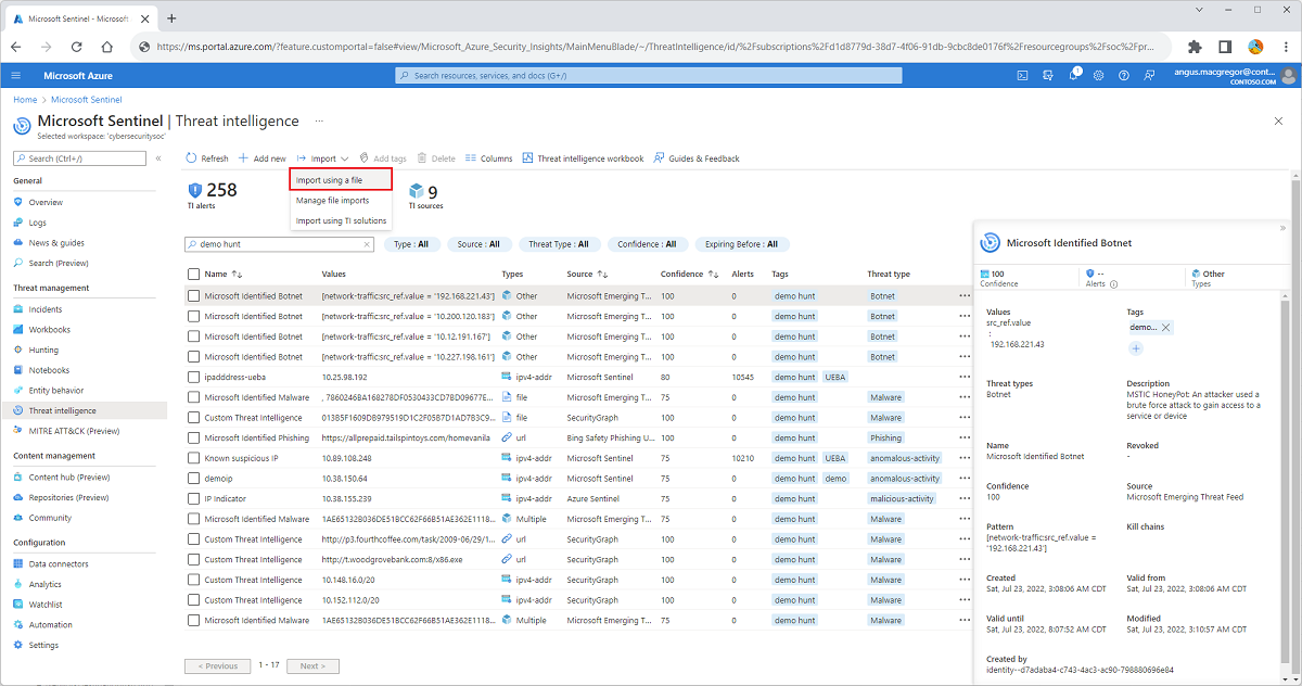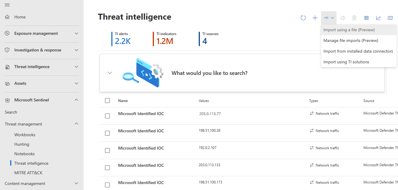 In diesem Artikel wird gezeigt, wie Sie Indikatoren aus einer CSV-Datei oder STIX-Objekte aus einer JSON-Datei in Microsoft Sentinel Threat Intelligence hinzufügen können. Da der Austausch von Bedrohungsinformationen während laufender Untersuchungen immer noch über E-Mails und andere informelle Kanäle erfolgt, ist die Möglichkeit, diese Informationen schnell in Microsoft Sentinel zu importieren, wichtig, um Ihrem Team neu auftretende Bedrohungen weiterzuleiten. Die identifizierten Bedrohungen stehen dann für andere Analysen zur Verfügung, etwa zum Erstellen von Sicherheitswarnungen, Vorfällen und automatisierten Antworten.