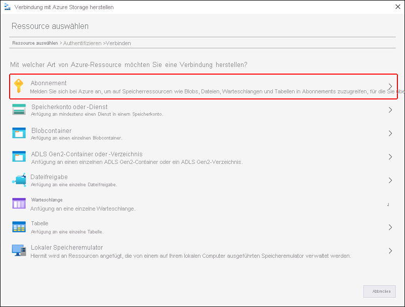 Wählen Sie im Panel Ressource auswählen die Option Abonnement aus.