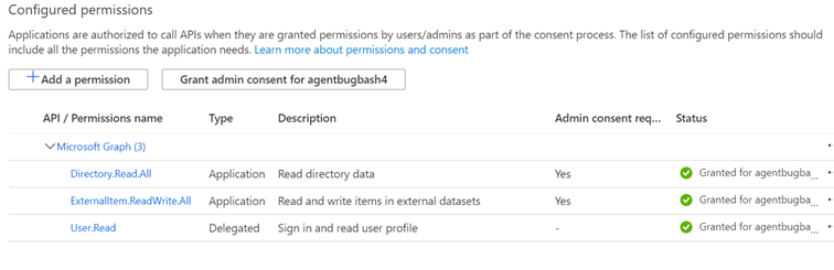 Berechtigung Wann ist die Erforderliche Berechtigung? ExternalItem.ReadWrite.OwnedBy oder ExternalItem.ReadWrite.All Immer ExternalConnection.ReadWrite.OwnedBy Immer Directory.Read.All Erforderlich für Confluence DC-, GitHub-Server-, Dateifreigabe-, MS SQL- und Oracle SQL-Connectors Wählen Sie Administratoreinwilligung für [TenantName] erteilen aus, und bestätigen Sie, indem Sie Ja auswählen.