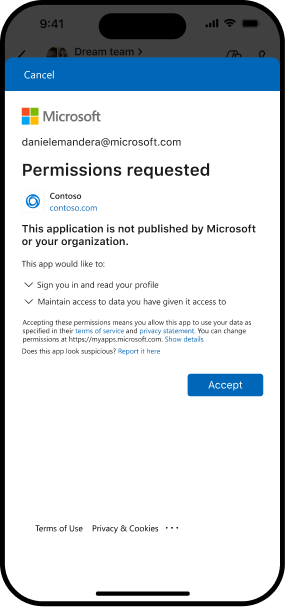 Das angezeigte Zustimmungsdialogfeld gilt für Open-ID-Bereiche, die in Microsoft Entra ID definiert sind. Der App-Benutzer muss seine Zustimmung nur einmal erteilen. Nach der Zustimmung kann der App-Benutzer auf Ihre Nachrichtenerweiterungs-App zugreifen und diese für die erteilten Berechtigungen und Bereiche verwenden.