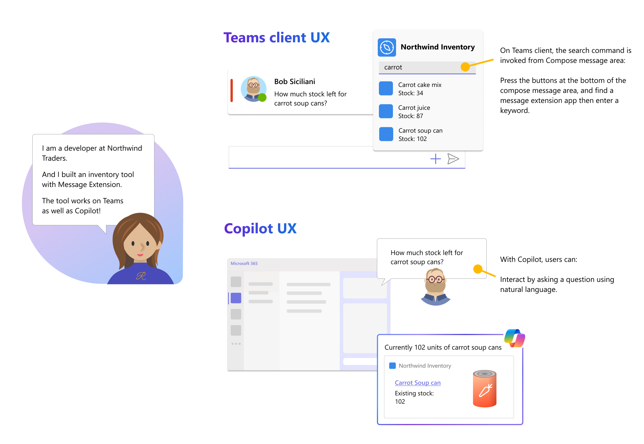 | Northwind-Bestandsnachrichtenerweiterung | In diesem Beispiel wird eine Teams-Nachrichtenerweiterung implementiert, die als Plug-In für Microsoft 365 Copilot verwendet werden kann. Mit der Nachrichtenerweiterung können Benutzer die Northwind-Datenbank abfragen. | Anzeigen |