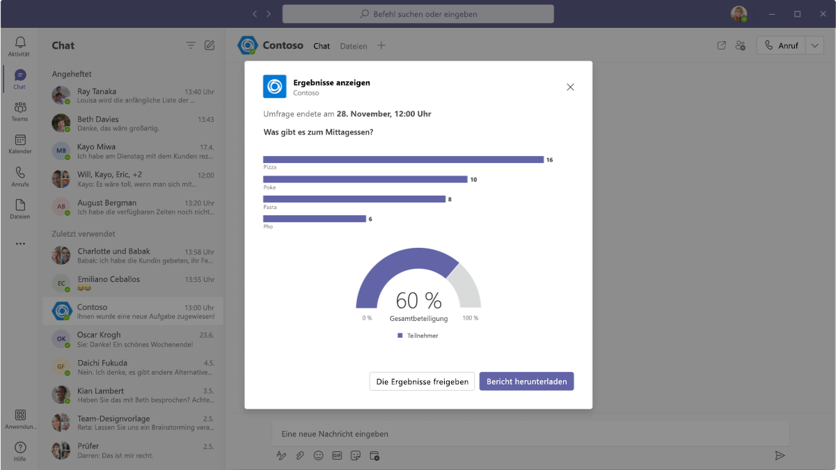 Dieses Beispiel zeigt Ergebnisse einer Umfrage, die von einer adaptiven Karte gestartet wurde. Die Umfrage kann auch in einem Dialogfeld platziert werden.