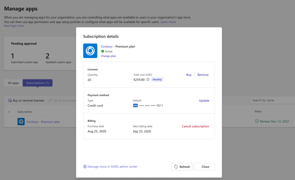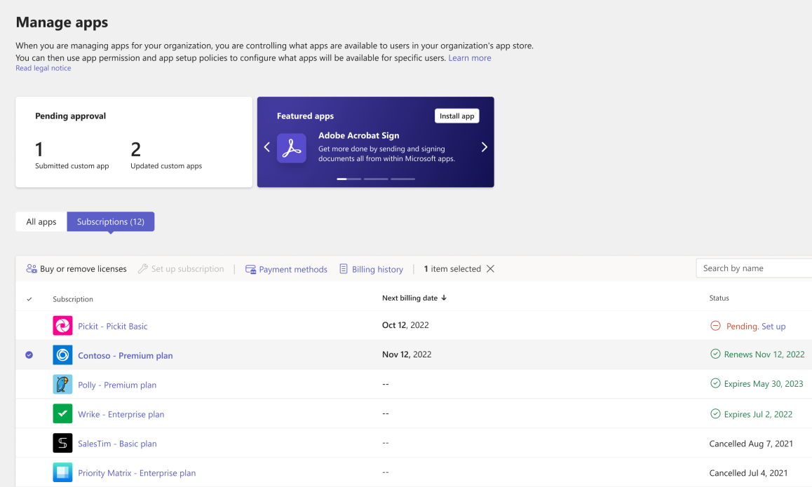 Im Teams Admins Center können Sie die erworbenen App-Abonnements und Lizenzen verwalten. Sie können die Liste der App-Abonnements und deren Details anzeigen und die folgenden Aktionen ausführen: