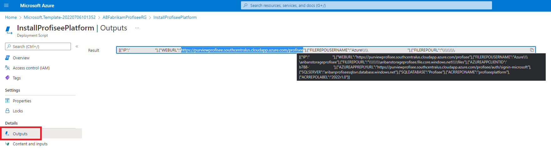 Rufen Sie unter Ausgaben die endgültige Bereitstellungs-URL ab. Die endgültige WEBURL müssen Sie in die Adressleiste Ihres Browsers einfügen und Profisee-Purview Integration genießen! Diese URL entspricht der URL, die Sie dem Profisee-Support beim Abrufen der Lizenzdatei bereitgestellt haben. Sofern Sie das URL-Format nicht ändern möchten, sieht es in etwa wie folgt aus: "https://[profisee_name]. [Region].cloudapp.azure.com/profisee/