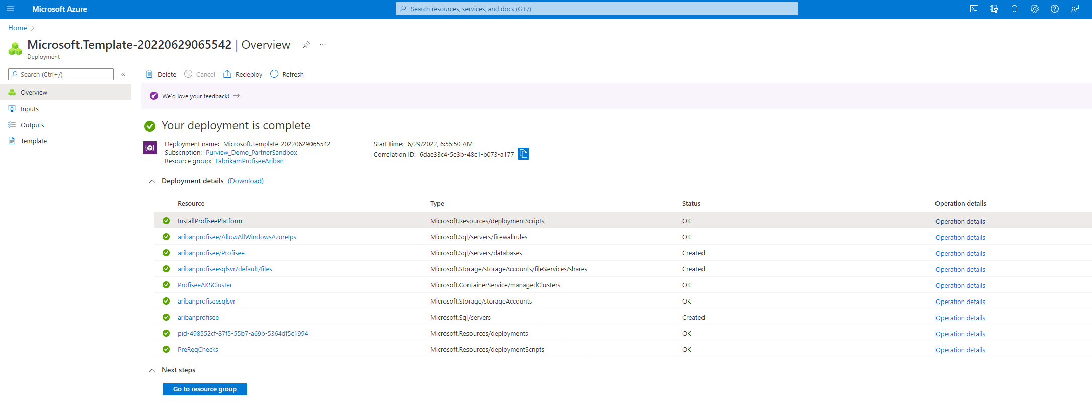 Wählen Sie nach Abschluss der Bereitstellung Microsoft Purview "Zur Ressourcengruppe wechseln" aus, und öffnen Sie den Profisee AKS-Cluster.