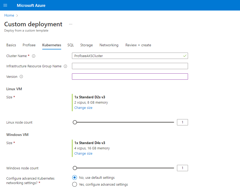 Auf der Seite Kubernetes können Sie bei Bedarf eine ältere Version von Kubernetes auswählen, aber lassen Sie das Feld leer , um die neueste Version bereitzustellen.