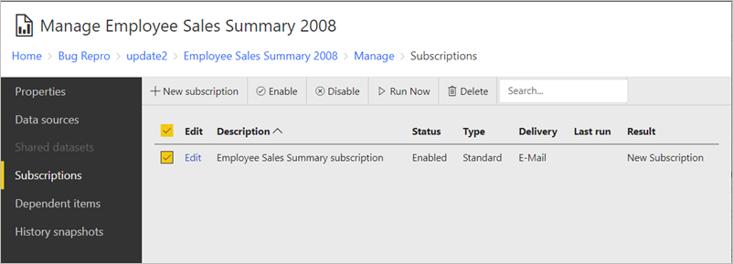 Abonnements werden nur für Berichte unterstützt, die unbeaufsichtigt ausgeführt werden können. Der Bericht muss zumindest gespeicherte oder gar keine Anmeldeinformationen verwenden. Wenn der Bericht Parameter verwendet, muss ein Standardwert angegeben werden. Abonnements können inaktiv werden, wenn die Berichtsausführungseinstellungen geändert oder die von den Parametereigenschaften verwendeten Standardwerte entfernt werden. Weitere Informationen finden Sie unter Erstellen und Verwalten von Abonnements für Berichtsserver im einheitlichen Modus.