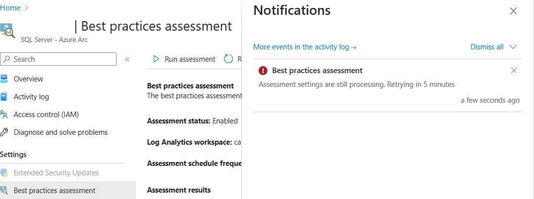 PATCH-Aufruf der API durch, um die Bewertungseinstellungen der Azure-Erweiterung für SQL Server zu aktualisieren.PATCH https://management.azure.com/subscriptions/ <subscription-id>/resourceGroups/<resource-group-name>/providers/Microsoft.HybridCompute/machines/<arc-resource-name>/extensions/WindowsAgent.SqlServer?api-version=2022-08-11-previewWechseln Sie zur Best Practices-Bewertung auf Ihrer Arc-fähigen SQL Server-Ressourcenseite im Azure-Portal, aktivieren Sie die Best Practices-Bewertung erneut, und wählen Sie einen neuen Log Analytics-Arbeitsbereich aus.