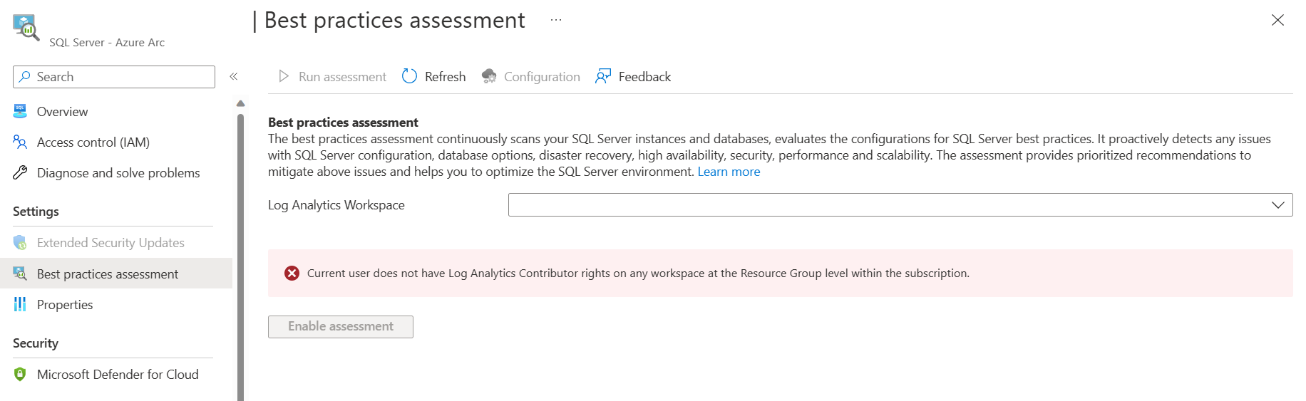Stellen Sie sicher, dass den Benutzer*innen, die SQL BPA konfigurieren, für die Ressourcengruppe oder das Abonnement des Log Analytics-Arbeitsbereichs die Rolle „Log Analytics-Mitwirkender“ zugewiesen ist. Die Liste der Voraussetzungen finden Sie im Artikel " Best Practices Assessment" .