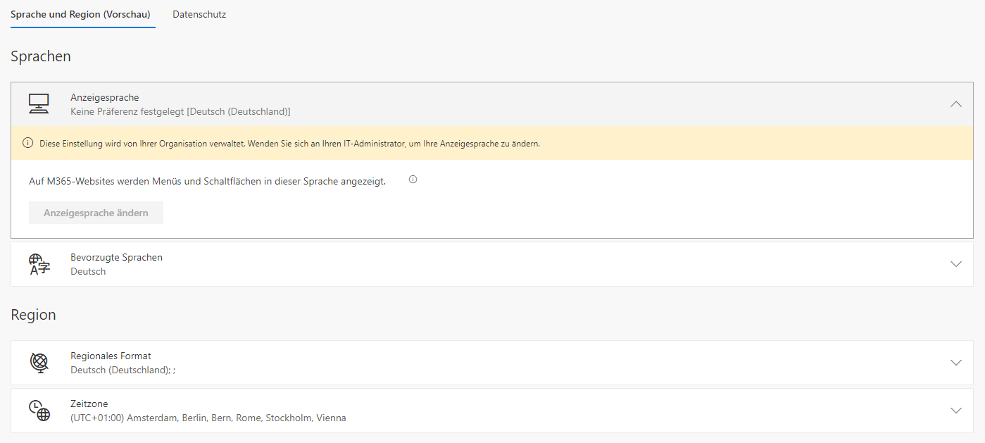 Stellen Sie sicher, dass Sie die Anzeigesprache und die Zeitzone im Microsoft 365-Profil ändern: