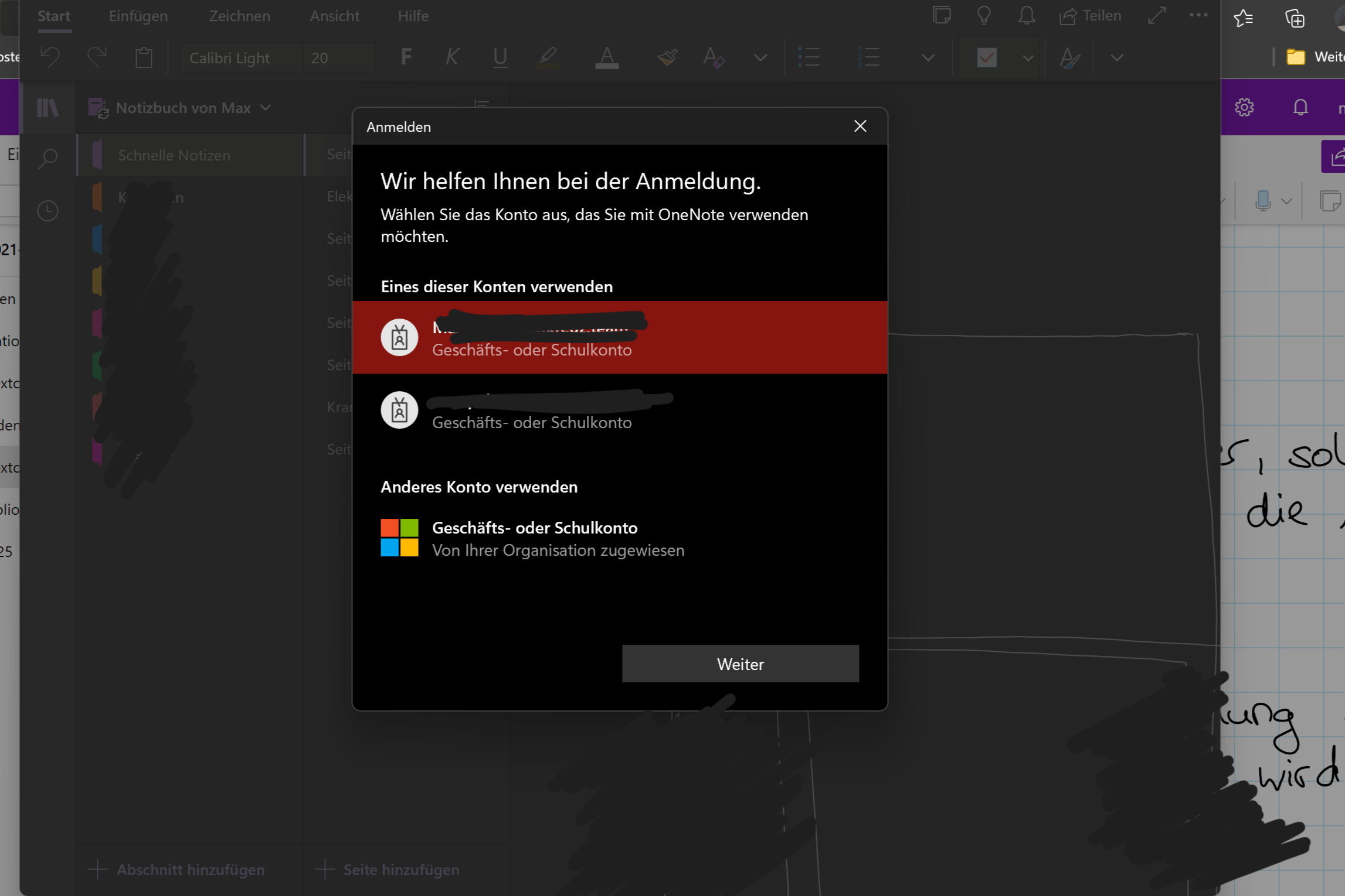 ich habe von meiner Schule ein Gastzugang in MS Teams, welcher mit meiner Mail verknüpft ist. Darüber nutzen wir auch OneNote, wo wir unsere Lernunterlagen hochladen. Das Problem: Wenn ich das Notizbuch hinzufügen möchte, so versucht OneNote sich mit einem Schul- bzw. Geschäftskonto zu verbinden (Ich habe 2 Geschäftskonten von einer Hilfsorganisation, mit denen ich angemeldet bin, möchte diese aber nicht mit meiner privaten Mail/Schulkonto verknüpfen).
