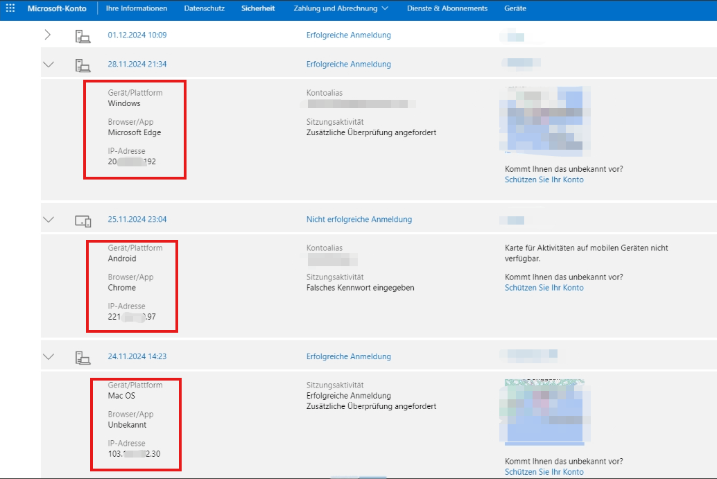 Hier können Sie das Gerät/Plattform, den Browser/App, die IP-Adresse usw. der Versuche, sich mit Ihrer Adresse anzumelden, einsehen.