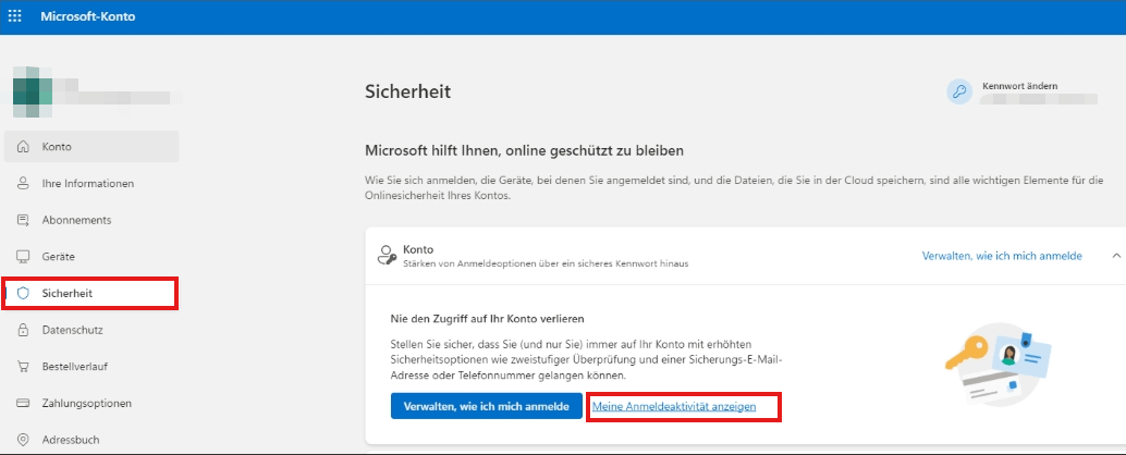 Bitte melden Sie sich an, um sich in Ihrem Konto anzumelden, klicken Sie auf "Sicherheit" - "Letzte Anmeldeaktivitäten anzeigen".