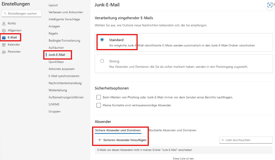Klicken Sie auf das Zahnrad (Einstellungen) in der oberen rechten Ecke - Mail - Spam - im Abschnitt Sichere Absender und Domains können Sie die Adressen oder Domains der Absender hinzufügen, die Sie auf die Whitelist setzen möchten. Geben Sie diese ein und klicken Sie auf "Hinzufügen".