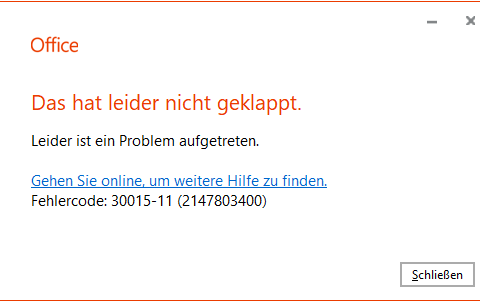 Danach habe ich den Pc neugestartet und dieses mal mit dem offline Installer Office installiert. Aber es Kam wieder der Fehler 30015-11