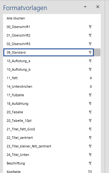 In diesem Dokument nutze ich allerdings eigene Formatvorlagen und nicht die von Word vorgegebenen. Die Formatvorlage für die Überschrift 1 heißt daher anders --> 00_Überschrift1