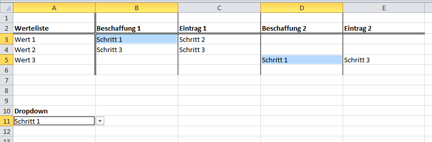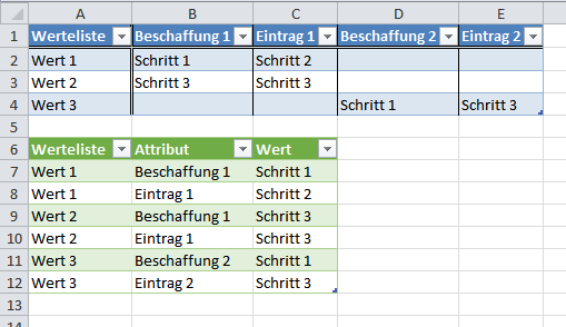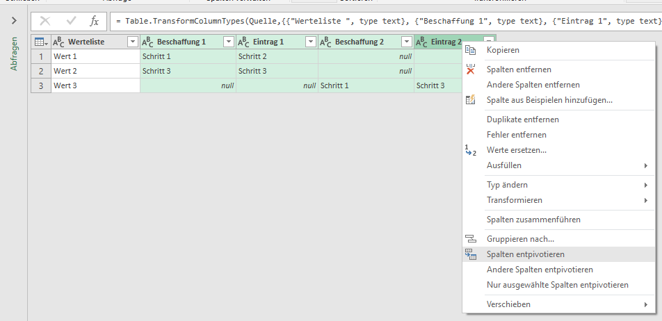 Wähle die Spalten "Beschaffung 1" bis "Eintrag 2" \ Rechts-Klick "Spalten entpivotieren"