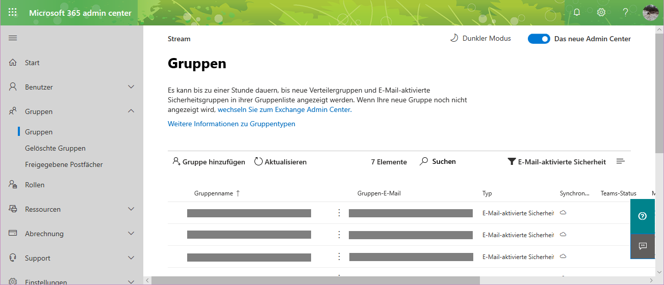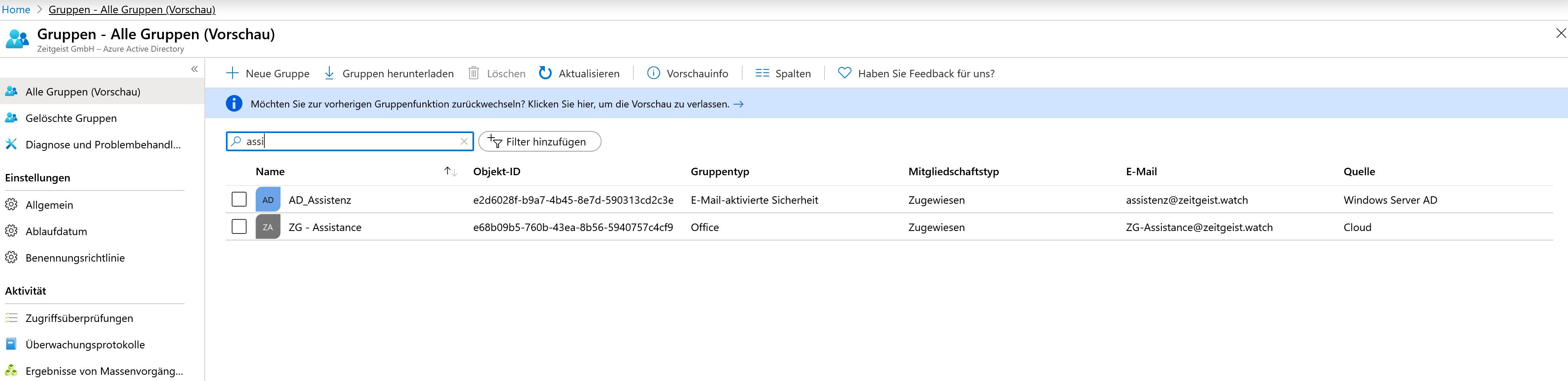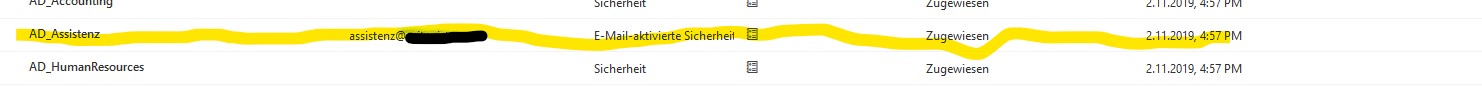 Die AD Gruppe dich ich zum testen nehme ist eine E-Mail aktivierte Sicherheitsgruppe und ich kann diese auch im Azure sehen.